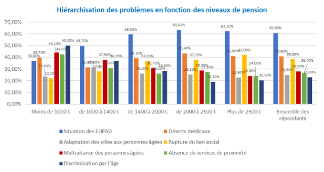 La discrimination par l’âge, les problèmes de maltraitance et la difficulté d’accéder à des services et à des documents administratifs sont les problèmes évoqués prioritairement par les retraités plus modestes.