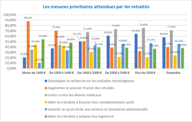 Vient en priorité l’augmentation du pouvoir d’achat pour 88 % des retraités percevant moins de 1000 €, puis l’aide à l’adaptation des logements pour 54 % d’entre eux et l’aide au financement des complémentaires santé pour 44 % des retraités plus modestes.