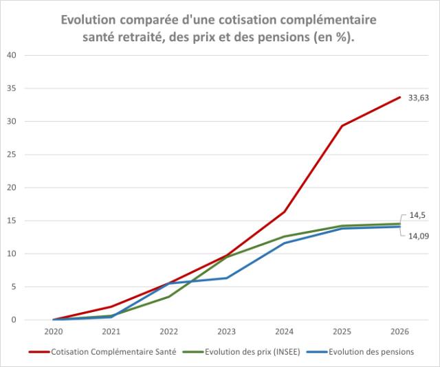 Ce graphique témoigne de l’importante distorsion entre l’évolution des tarifs d’une part et l’évolution des prix et des pensions en euros courants d’autre part sur la même période. Même en ajoutant foi à l’argument de la Mutualité Française qui affirme que les coûts de santé ont progressé de 4% par an depuis la crise du COVID, on pourrait admettre une augmentation de 20% des cotisations, mais beaucoup plus difficilement de 33,6% !