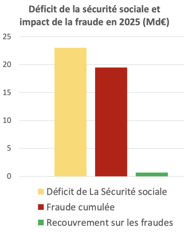 Si l’on ajoute les 14 milliards d’euros de fraude à la Sécurité sociale et les 5,5 milliards d’euros relevant de la fraude aux taxes affectées, on arrive à un total de 19,5 milliards d’euros équivalant à 85% du déficit de la Sécurité sociale.
