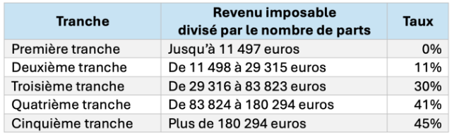 Le barème applicable pour le calcul des impôts sur vos revenus de 2024 est donc le suivant :