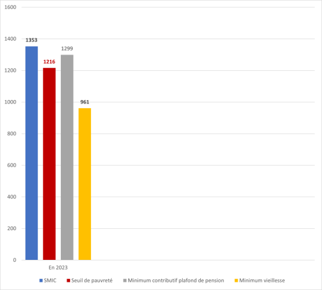 Pour comparaison, le seuil de pauvreté en 2022 (à 60% du revenu médian) était de 1216 € pour une personne seule.