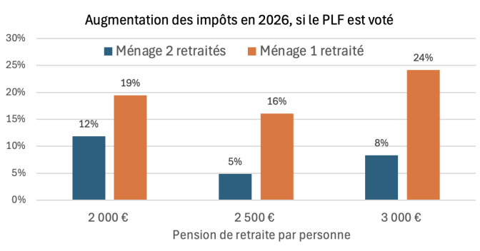 La seule transformation de l’abattement provoquerait une augmentation des impôts de 10 % pour une pension mensuelle de 2000 €, 11 % pour 2500 € et 17% pour 3000 €, contre respectivement 4 %, 1 % et 2 % pour un couple de retraités.