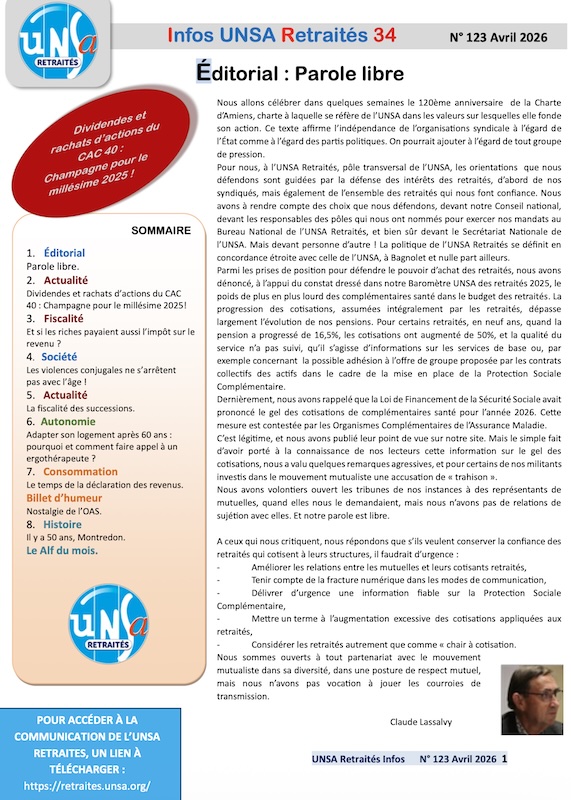 Parmi les prises de position pour défendre le pouvoir d’achat des retraités, nous avons dénoncé, à l’appui du constat dressé dans notre Baromètre UNSA des retraités 2025, le poids de plus en plus lourd des complémentaires santé dans le budget des retraités. La progression des cotisations, assumées intégralement par les retraités, dépasse largement l’évolution de nos pensions. Pour certains retraités, en neuf ans, quand la pension a progressé de 16,5 %, les cotisations ont augmenté de 50 %, et la qualité du service n’a pas suivi, qu’il s’agisse d’informations sur les services de base ou, par exemple, concernant la possible adhésion à l’offre de groupe proposée par les contrats collectifs des actifs dans le cadre de la mise en place de la Protection Sociale Complémentaire.