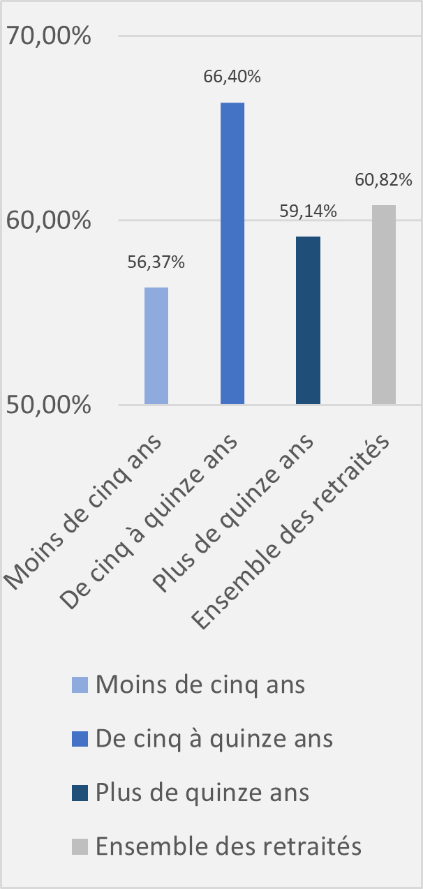 Les retraités qui sont à la retraite depuis plus de 5 ans et moins de 15 ans sont les plus investis dans le bénévolat. Ils sont deux sur trois à pratiquer une activité bénévole.