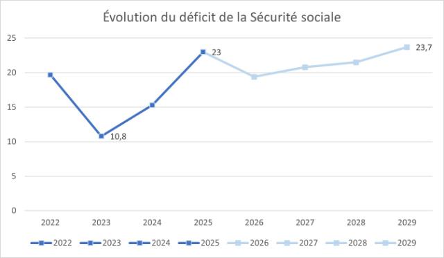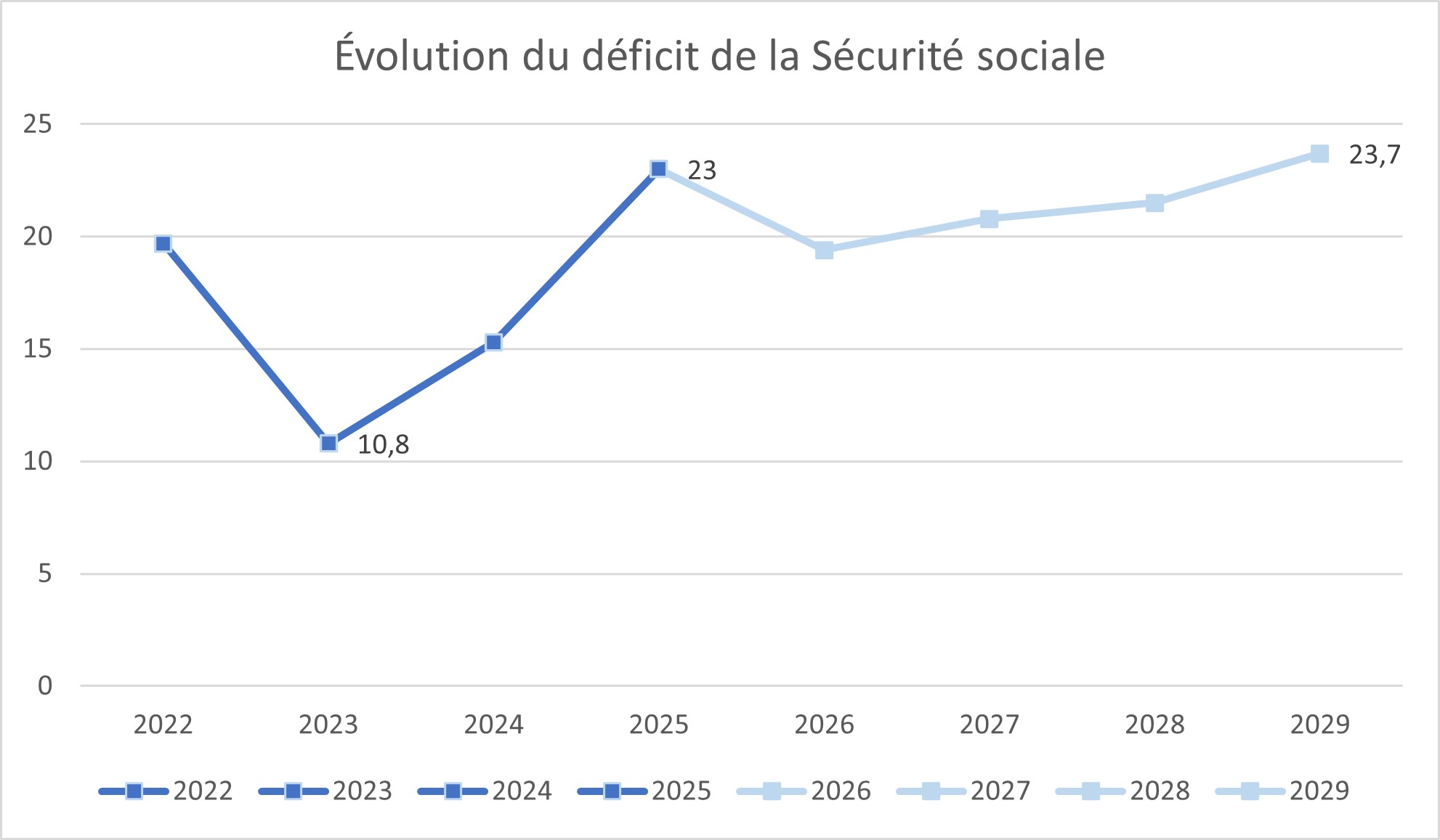 Le déficit de la Sécurité sociale accusait en 2025 un total de 23 milliards d’euros imputable à une tendance divergente entre les dépenses en augmentation de +3.6% et les recettes en progression de seulement 2.4%.