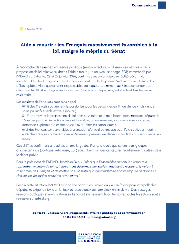 Le sondage commandé par l’ADMD a été réalisé par l’IFOP les 28 et 29 janvier 2026 et rendu public le 9 févier.