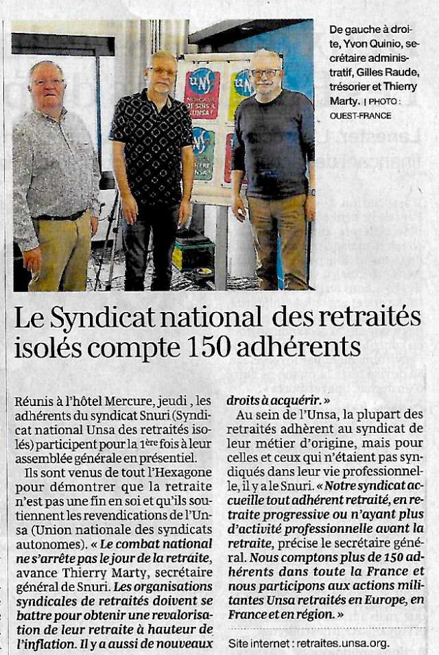 Réunis à Lorient les adhérents du SNURI (Syndicat National Unsa des Retraités Isolés) ont participé pour la première fois à leur Assemblée Générale en présentiel ainsi qu’en visioconférence dans la salle de conférence de l’hôtel Mercure à Lorient.