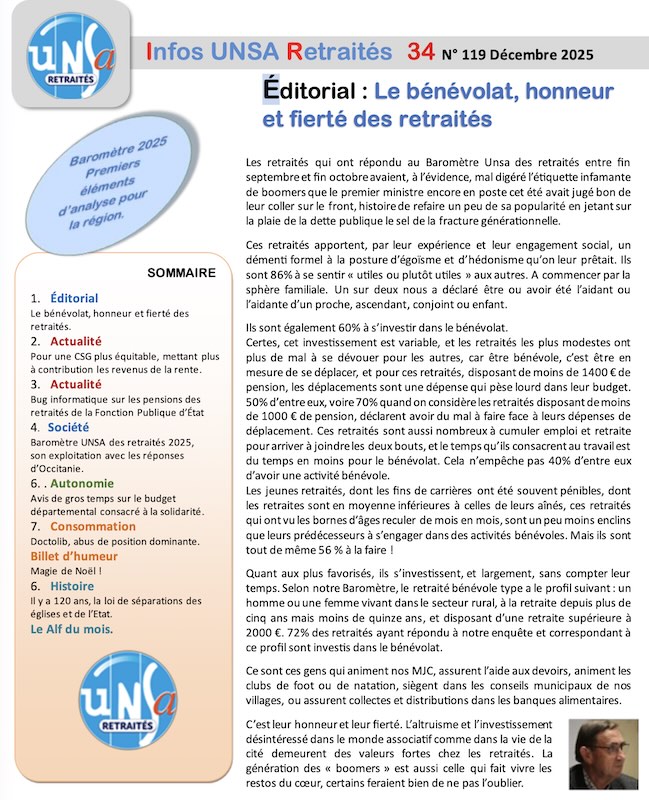 Si cette mesure va dans le bon sens, elle reste insuffisante. Pour l’UNSA Retraités comme pour l’UNSA, il faut aller plus loin et rendre la CSG progressive, en lui appliquant un barème progressif, en fonction de tranches selon le principe appliqué à l’impôt sur le revenu
