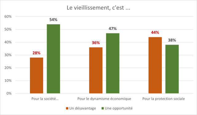 Mais ce sont majoritairement les plus de 50 ans qui pensent le vieillissement en termes d’opportunité, les plus jeunes sont plus réservés mais paradoxalement ils ont une moins mauvaise opinion des conséquences du vieillissement sur le système de protection sociale que les plus âgés.