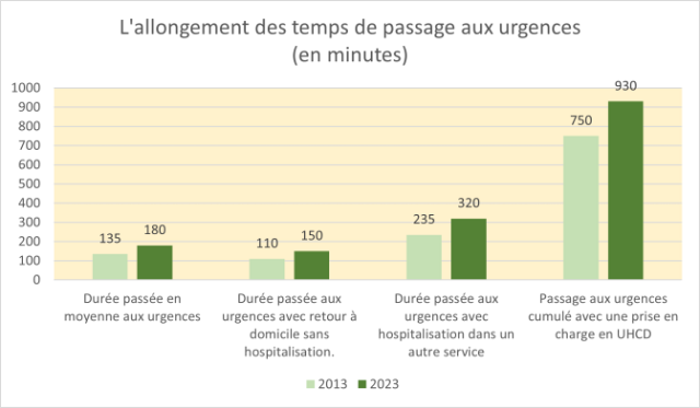 Pour les 11% de patients orientés vers un service de soin autre qu’une Unité Hospitalière de Courte Durée (UHCD), la durée médiane passée en service d’urgence a fortement progressé : elle est passée de 3 heures 55 minutes à 5 h 20 minutes.