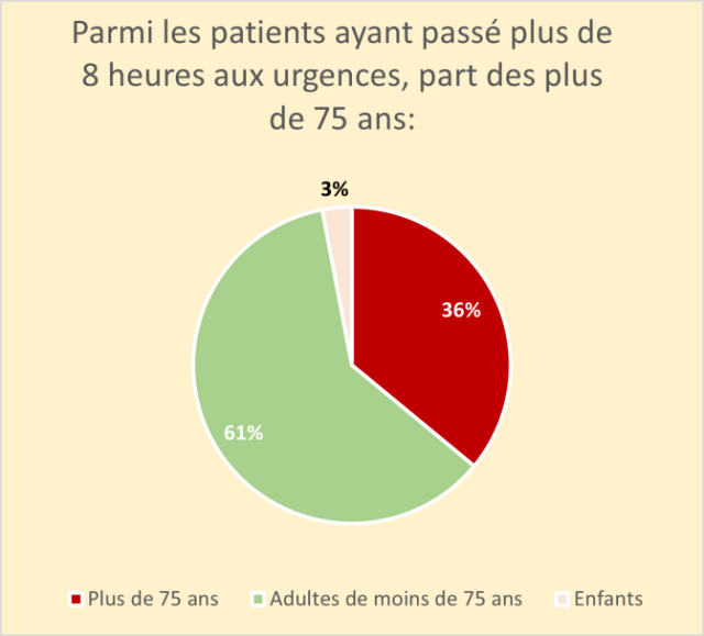 15% des patients passent plus de 8 heures aux urgences. Cette attente très longue ne concernait, il y a 10 ans, que 9% des patients consultant via le service d’urgence. Au sein de ce groupe de patients, on dénombre 36% de personnes âgées de plus de 75 ans, on en comptait seulement 24% en 2013. Cela signifie que le jour témoin retenu par l’enquête de la DREES, un 13 juin, jour peu propice aux épidémies , 3159 personnes de plus de 75 ans ont passé plus de 8 heures aux urgences. Parmi ces personnes, certainement des résidents en Ehpad, que l’on oriente vers les urgences faute de médecin à même d’intervenir dans la structure.